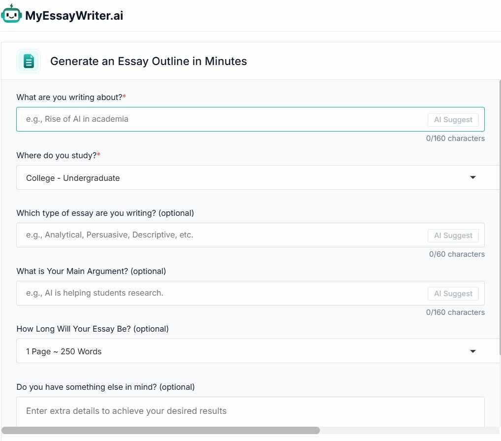 Whether you’re writing for school, college, or work, the MyEssayWriterai Essay Outliner is a game-changer. It gives you the structure you need to start strong and stay organized throughout your writing process.